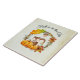 A ceramic tile with a typography design which says Fall is in the air. Illustrated with an adorable squirrel standing behind some orange watercolor pumpkins. A decorated foliage wreath surrounds them with an oak leaf, an acorn, autumn orange flowers and other sprigs and leaves. Background colour is a vintage looking off-white with aged light brown edges.