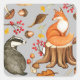Autumn woodlands themed sticker features fox and badger with leaves, berries, mushrooms and acorns on light grey background.