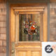 Autumn woodlands themed window cling panel features fox and badger with leaves, berries, mushrooms and acorns on light grey background.