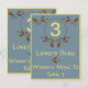 Fall Leaves Bunco Table Card #1 graphic art design by Artinspired*. Use this at your Bunco game during the month of October and November or all year round. Stylish design features a colour scheme of blue,yellow and brown. Design elements include oak leaves with acorns and a round ornament to place your table number. Text reads Winners Stay and Losers Move To Table 3. Text and table number can be changed. This card would also work for weddings,luncheons,teas,fundraisers,dinners and other events were a table card is required.