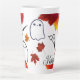 Tall latte mug gift for a hairdresser. Cute ghosts, scissors, and bright red and orange leaves are all part of this design. Personalise with her name in the bottom corner.
