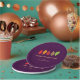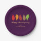 This paper plate features a graphic of brightly coloured autumn leaves. The colours use in this simple but bold design are red, orange, brown and lime green on deep dark purple background. Customisable text, in light orange, reads: Happy Thanksgiving. Personalise this paper plate with your name and the year.
