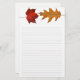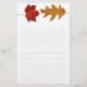 Lined writing paper with fall leaves header. An oak leaf and red maple leaf make a seasonal border at the top of white note paper, with no text. Use to write a thank you note or say hello.