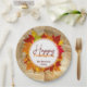 Celebrate the spirit of gratitude and unity with our one-of-a-kind custom Thanksgiving paper plate. Immerse yourself in the harmonious blend of a modern font pairing, where a sophisticated, artisanal script effortlessly complements a sleek, contemporary sans serif. Enclosed by an immaculate white circle enhanced with a subtle hint of crimson, behold a mesmerising array of maple leaves, presenting the intricate tapestry of autumn's vibrant palette – a graceful progression from gleaming golds to blazing reds and warm, earthy browns. The text stands gracefully, a blank canvas ready to embrace your personal essence, allowing you to craft a genuinely distinctive and heartfelt message.