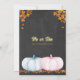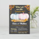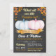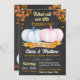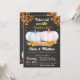 The invitation features Pink and Blue pumpkins with fall leaves. This design is perfect for a fall-themed gender reveal party.