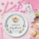 This baby shower paper plate features a watercolor pumpkin and fall greenery gold foliage wreath.