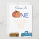 1st birthday pumpkin invitation with blue truck and blue plaid design, easy to edit text.