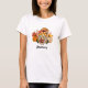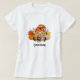 Adorable Fall/Autumn gnome t-shirt celebrating the pumpkin spice season. Whimsical design of a fall gnome between two pumpkins, holding a pumpkin spice hot beverage. The name on the t-shirt is customisable with your own.