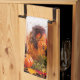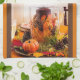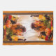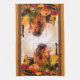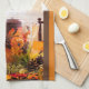 Kitchen towels with a beautiful decor setting of Fall colours of red, orange, brown and yellow, and Fall items like small pumpkins, Autumn leaves and a large brown candle in a hurricane jar. The pictures are accented with a brown stripe down either side and an orange stripe down either side of the brown ones.