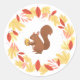 A happily giving squirrel holds a gifted nut from autumn's bountiful harvest. Leaves of lemon yellow, burnt sienna, and coral adorn the scene. Original illustration by artist, Noël Ill.