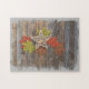 Fall coloured jute leaves surround two stars and two small hearts o a rustic background of weather fence boards. Fun puzzle for the whole family. The staged original photo is masked to blend seamlessly with a variety of backgrounds.