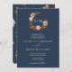 Navy Blue Fall Terracotta Monogram Wreath Wedding Invitation. This elegant and rustic wedding invitation features hand-painted watercolor burnt orange and terracotta leaves, cream and beige dahlias, and beautiful rust-coloured roses perfect for a fall or autumn wedding! The back of the invite has a beautiful leaf and floral pattern on a navy blue background that can be easily deleted if you prefer.
