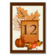 Bring the outdoors inside with this Fall themed wedding reception table number card done in rich brown and cream. Graphics of Fall coloured leaves in rust, orange, and brown, and a pumpkin decorate a golden rust coloured text area, in the middle. Personalise the dark reddish brown number, for each table at your reception.