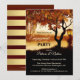 Elegant engagement party invitation featuring a colourful autumn tree and festive lantern overlooking a romantic lake. The back side shows a gold and burgundy gradient striped design.