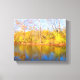A photograph taken on a sunny autumn day of yellow trees reflecting on blue water.