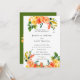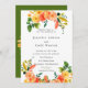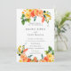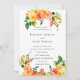 Elegant floral wedding invitations for summer or fall weddings feature your details accented by top and bottom with borders of soft watercolor cabbage roses, and greenery in colours peach, gold, orange and green. Cards reverse to autumn orange with watercolor flowers overlay at centre.