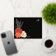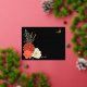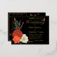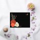 Elegant Gold foil invitation lettering on elegant black background is complemented by colourful autumn dahlias, roses, anemone, wheat stalks and monarch butterflies to make a striking but simple wedding invitation postcard. The Monarch butterfly emphasises the gold foil text on the front and the couple photo on the back for a truly autumnal wedding theme. A QR code template lets you save postage and the planet with one mailing.