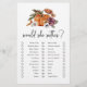 Dive into a dreamy autumnal escape with our enchanting Fall Would She Rather Game. From hand-painted watercolor pumpkins and blossoming burgundy and terracotta fall flowers to rustic forest green and rust botanicals — every detail is thoughtfully painted. Add a personal touch with burnt orange or burgundy calligraphy on invitations, napkins, and favour tags. Complement the scenery with themed party games, baked goods, and much more! Celebrate love in the most magical way.