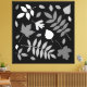 Fallen leaves design in different leaf silhouettes in greys and white on a black background.