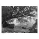 This black and white seascape photogrpah features a tree overhanging the water along the shore at Lake Erie. The rocky coast with boulders of different sizes lines the waters edge. The leaves have a feathery appearance as the tree trunk, branches and leaves, lying horizontal, overhangs the water. This scenic landscape photograph was taken along the coast of Lake Erie, Ohio.