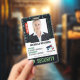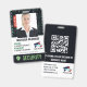 Medium sized vertical employee ID badge for your cyber security department, with a falling code background in green, cyan, and blue. Security is written at the bottom of the badge with a shield with a keyhole next to the text. Customize the security ID badge with name, title, department, ID number, issue date and expiration date, and logo. On the back, there's a QR code and additional customizable text.