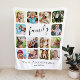 Create your own personalised keepsake sherpa blanket for yourself or as a gift for a loved one, featuring "family" written in modern script (you can change this), fourteen rounded square frames holding your favourite photos of family, pets, travels or other special memories and two lines of customisable text, such as your family name and the year established.