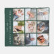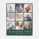 This keepsake fleece blanket features a collage of nine of your favourite square family photos on an emerald green background Add your family's name and establishment date or other text at the bottom in white serif font.