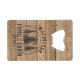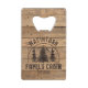 Create a personalised family cabin bottle openere featuring a rustic, country wood plank design with forest pine trees and NAME FAMILY CABIN and year established date or other text in brown. ASSISTANCE: For help with design modification or personalisation, transferring the design to another product or if you would like coordinating items, contact the designer BEFORE ORDERING via the Zazzle Chat MESSAGE tab below or email makeitaboutyoustore@gmail.com.