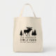 An eco-friendly reusable grocery bag with your personalised family name and cabin, cottage or other desired text along with an established date and location. This custom design features rustic style typography with artwork of a moose and pine trees silhouette in black. To see more designs like this, feel free to visit my store here at "Zazzle.com/Rustic_Charm". Thanks.