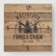 Create a personalised family cabin wall clock featuring a rustic, country wood plank design with forest pine trees and NAME FAMILY CABIN and year established date or other text in brown. The sample is shown in the square option; choose round on the ordering page. ASSISTANCE: For help with design modification or personalisation, transferring the design to another product or if you would like coordinating items, contact the designer BEFORE ORDERING via the Zazzle Chat MESSAGE tab below or email makeitaboutyoustore@gmail.com.