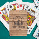 Rustic personalised family cabin playing cards featuring a scenic landscape drawing of trees against a brown wood plank background personalised with NAME FAMILY CABIN and Established Year. ASSISTANCE: For help with design modification or personalisation, colour change, resizing or transferring the design to another product, contact the designer BEFORE ORDERING via the Zazzle Chat MESSAGE tab below or email makeitaboutyoustore@gmail.com.