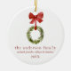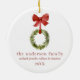 A personalised christmas family keepsake christmas tree ornament. This ceramic ornament features a rustic boxwood greenery christmas wreath hanging from a red bow. Personalise with your last name, family member names, and year or customise with any wording of your choice.