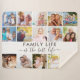 Create your own family photo blanket. The photo template is set up for you to add 15 of your favourite photos, all of which are displayed in square instagram format. The photo collage is set out in a grid style on a white background with black typography. "family life is the best life" is lettered in modern uppercase print and elegant handwritten script.