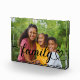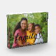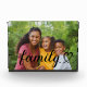 Modern and stylish custom horizontal tabletop photo block features a favorite photo with a minimal "family" typography overlay design that includes elegant flourish and cute heart details. The black text color can be modified.