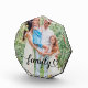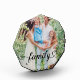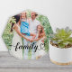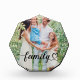 Modern and stylish custom tabletop photo block features a favourite photo with a minimal "family" typography overlay design that includes elegant flourish and heart details. The black text colour can be modified.