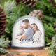 Modern and stylish custom Christmas snow globe features a favourite photo with a minimal black "family" typography overlay design that includes elegant flourish and heart details. The black script text colour can be modified.