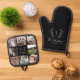 Create youor own personalised family monogram, name and established year with 8 photo grid collage making an elegant rustic farmhouse style black and white oven mitt and pot holder set. +++++++ A thoughtful keepsake gift for Christmas, wedding, family anniversary, new home or Thanksgiving.