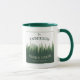 A beautiful, rustic themed, two tone coffee mug with your personalised family name and cabin, lodge or other desired text and it's location. This custom design features artwork of a pine tree forest silhouette in shades of forest and hunter green. Feel free to visit my designer store to see more items and designs like this. Thanks.