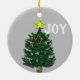 Lovely keepsake Christmas tree decoration to personalise with Family Name and Family Established Date underneath red white striped candy cane with Merry Christmas written in white text. Reverse side has Joy written below pretty decorated Christmas tree with yellow star, candy canes, ornaments and gingerbread man. Original Artwork © TamiraZDesigns.