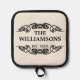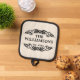 Explore a unique pot holder featuring a sleek and stylish black typography script design set against a cream ivory backdrop, customisable with your family's surname in a black typography style on a cream ivory background. Incorporate the date your family was established to craft an item as singular as your collective heritage. This charming, ornamental, and fashionable design is ideal for both the domestic baker and the professional chef.