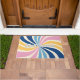 With a retro twist, personalize your doormat with a 70s inspired, colorful sunburst. The family name or other custom text is in layers, with the top layer being outlined text. The sunburst features pink, creme, yellow, light blue, and blue colors.