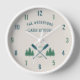 A beautiful, rustic themed wall clock, featuring your family name and lake house, cabin, cottage or other desired text and its established date, all in rustic style typography. This unique, custom design features teal blue boat oars, paddles and pine trees in soft green. The designs cream base colour is easily customisable to match your current decor. To see more designs like this, feel free to visit my store here at "Zazzle.com/Rustic_Charm". Thanks.