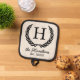 Discover a distinctive pot holder adorned with a sophisticated black typography and calligraphy script on a cream white fabric, customisable with your couple's names and family surname in a black typography style on a cream ivory background. Add your family's founding date to create an item as unique as your collective story. This attractive, decorative, and stylish design suits both the home baker and the professional chef equally.