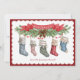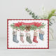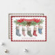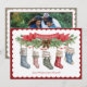 This Christmas card features 5 stockings hanging from a seasonal foliage swag, for each member of your family. You can personalise each stocking with a name. There is a red banner above the swag with the greeting "Merry Christmas." The back features a photo of your family.