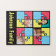 Family photo collage special memories keepsake puzzle. This special puzzle has space for 4 images, and is interspersed by overside interlocking puzzle pieces. The puzzles are colourful with a black background. They are yellow, blue and red, with every fourth piece space for a unique family photo. At the base of the puzzle is room for the family name but other custom text. This would make a great gift for grandparents or for the whole family.