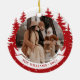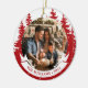 Modern, elegant Christmas ornament. Design features pine trees background, and snow , 2 family photo, family name and year. Perfect as a gift or a keepsake.