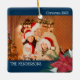 Poinsettia family photos Christmas ornament with year and stylish navy blue and white floral clip art.