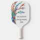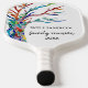This pickleball paddle features a family tree in rainbow colours and simple typography.
