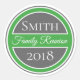 Round green and grey Family Reunion Badge with grey and white outlines. Keepsake gift can be personalised with your own event information.