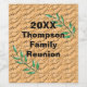 Create a memorable keepsake for your next family reunion with these unique wine bottle labels. The year and your family's name appears in the centre of this wine label. The text is surrounded by tree branches with bright green leaves. The brown background resembles a basket weave or cracked earth pattern. All text can easily be personalised for your large family gathering.